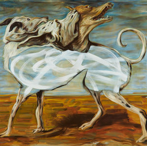 Elements from the classical past, such as loyal animals and folded drapery, are brought back to life to play new roles in a personal language of form and content, disrupted by the contemporary ease of computer distortion.